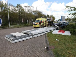Automobilist rijdt wegbewijzerings- en prijsbord uit de grond, bestuurster gewond