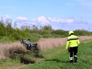 Auto over de kop op Oesterdam bij Tholen