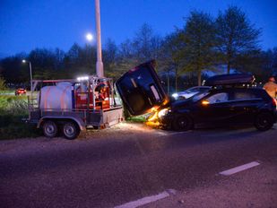 Auto en busje botsen, busje komt op zijkant tegen paal terecht