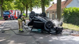 · Na de klap tegen de boom belandde de auto op zijn kop terug op de weg, en vloog vervolgens in brand. Het slachtoffer kon uit de auto gehaald worden.
