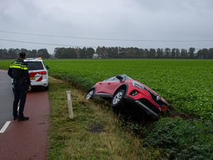 · Door de klap raakte de auto wel flink beschadigd. De bergingsdienst heeft de auto uit de sloot getakeld. Daardoor was de weg even dicht.
