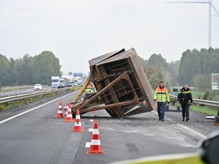 · De grijpbak paste niet onder het viaduct en is door de klap van de oplegger gevallen. Er raakte niemand gewond.