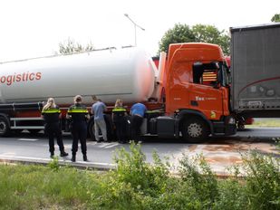 · Bij de botsing ontstond een flinke vloeistoflekkage. Hoe het ongeluk kon gebeuren is niet bekend. Er raakte niemand gewond.