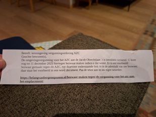 · Het strookje papier, dat huis-aan-huis is verspreid, vermeldt dat inwoners nog tot 11 december de mogelijkheid hebben om bezwaar te maken.