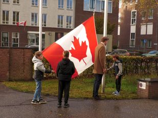 · Zo'n 125 leerlingen van bassischolen De Dobbelsteen en De Klimop waren vrijdagochtend aanwezig bij het hijsen van de Canadese vlag.