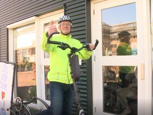 · Normaal rijdt Marcel Goudswaard met een groot advertentiebord achter zijn elliptigo, een revalidatiefiets waarbij de fietser rechtop staat. Normaal fietst hij rond met advertenties,…