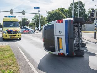 · Een bestelbus is maandagochtend op zijn kant terecht gekomen na een botsing met een personenauto. Bij het ongeluk raakte de…