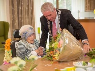 · Burgemeester Jacques Niederer heeft donderdagmiddag mevrouw Koning-de Jong gefeliciteerd met haar 106e verjaardag. Daarmee is ze de oudste inwoonster van Roosendaal.