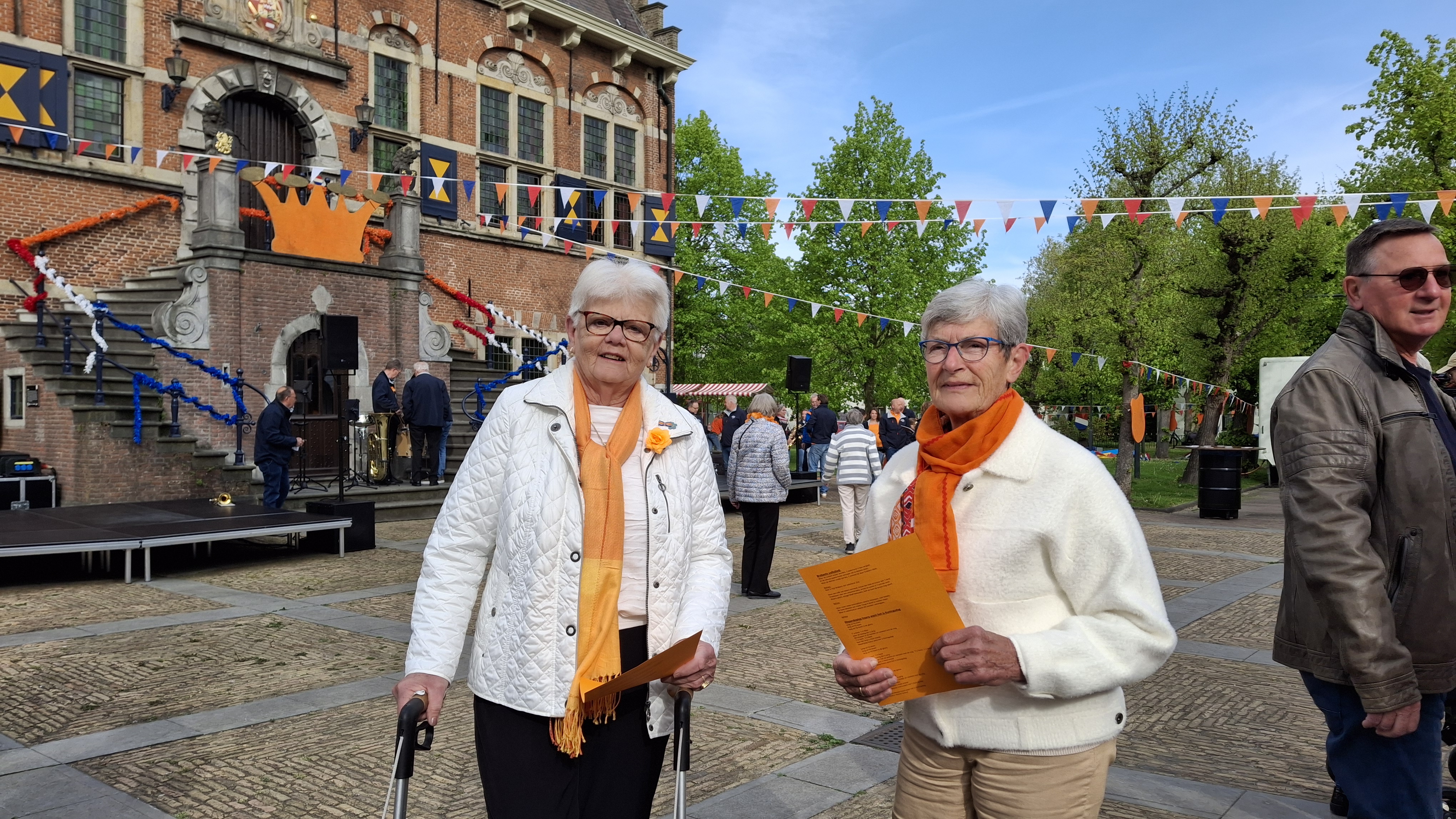 Nienke en Jopie zijn een van de eerste die klaar staan op het plein voor het stadhuis. “We hebben de liedjes al gekregen”, zeggen ze met een oranje A4-tje in de hand. Daar staat naast het Wilhelmus ook de andere liederen op. “Natuurlijk het Klepperlied, dat hoort er ieder jaar bij. Het Brabants volkslied niet te vergeten”, laten ze zien.