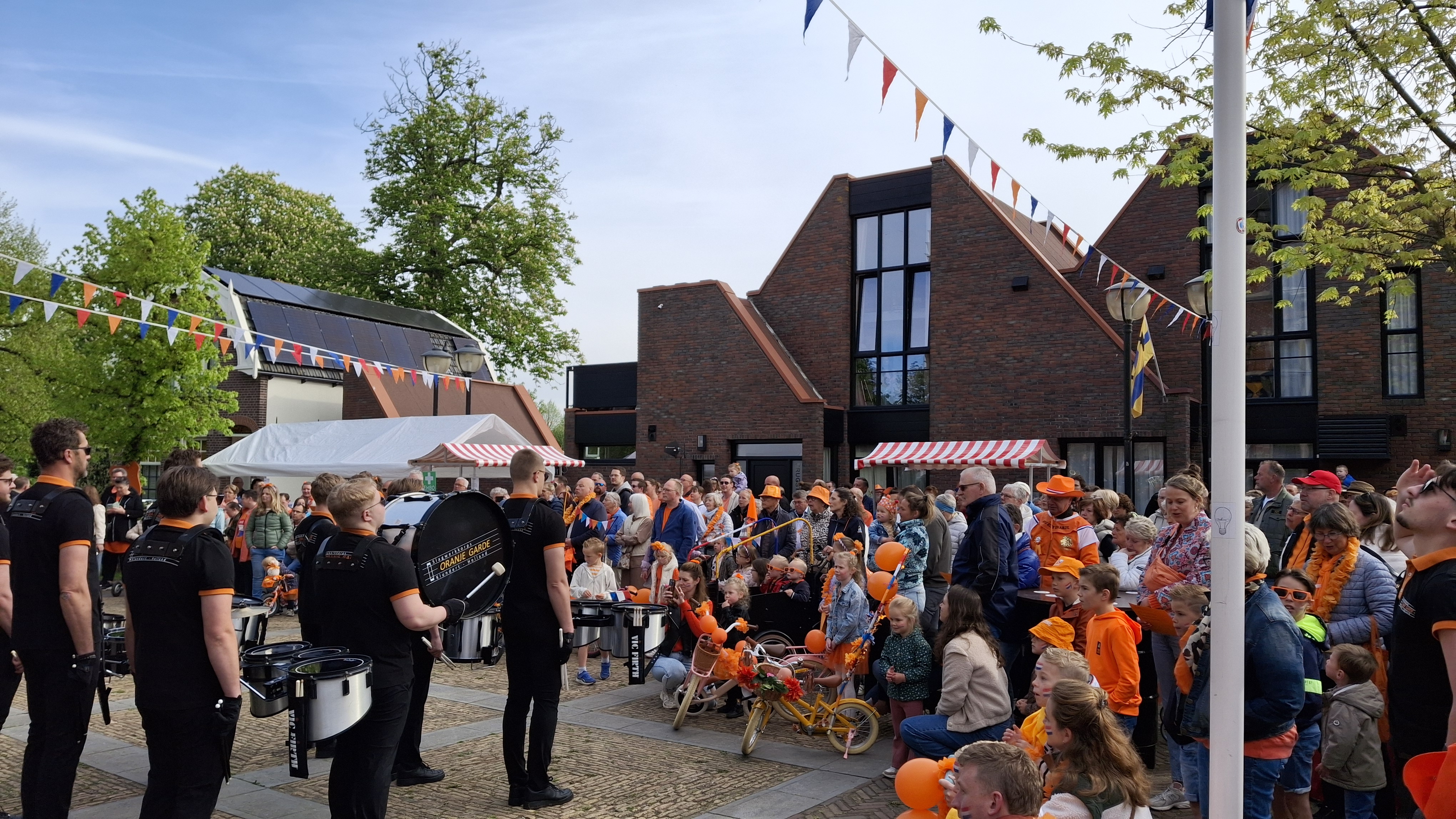 Vlak voor half tien komen de bandleden met hun instrumenten het plein oplopen. Alles wordt klaargezet en nog een keer gecheckt. “We zijn de laatste puntjes op de i aan het zetten, voordat we zo echt kunnen beginnen”, vertelt Thijs van den Berge, voorzitter van Oranjecomité Klundert. Tijdens de aubade wordt gestart met het Wilhelmus en daarna volgen nog een aantal liederen. Die worden muzikaal begeleid door muziekvereniging Determinato.