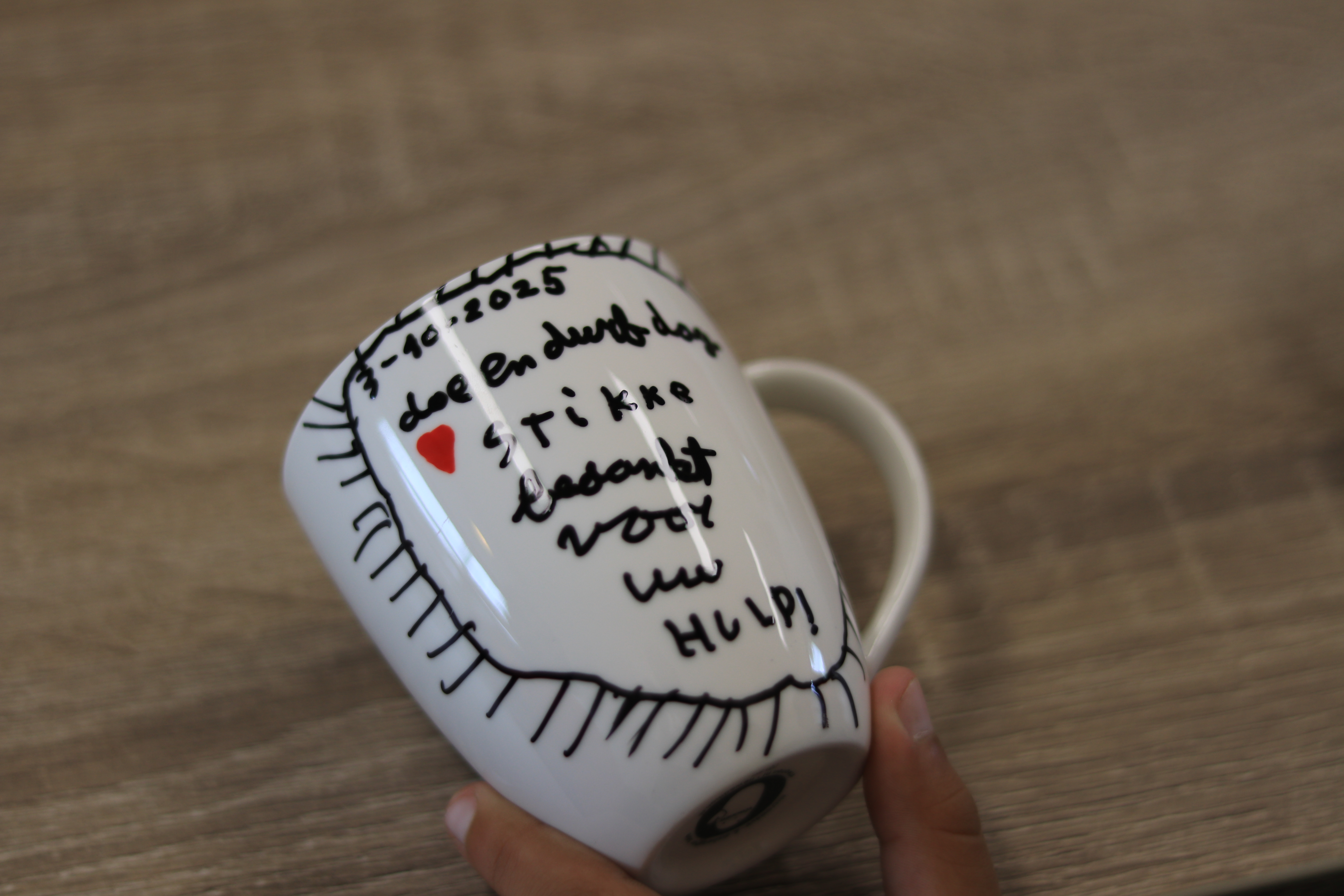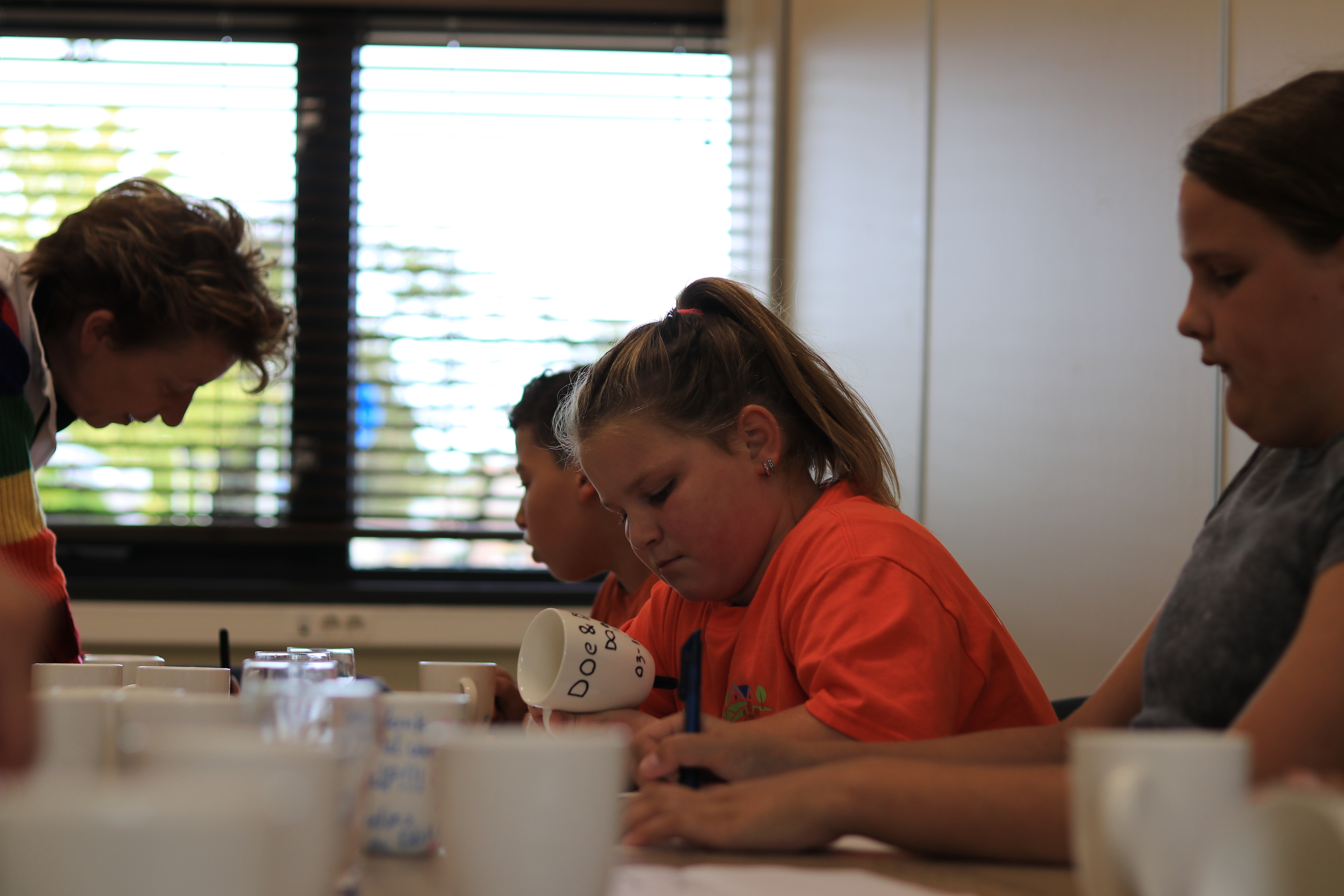 Nadat de stand van zaken is doorgenomen, worden de jonge vrijwilligers aan het werk gezet. Er moeten nog cadeautjes gemaakt worden voor de mensen die helpen bij de Doe & Durf dag, als bedankje. Daarvoor versieren ze elk drie mokken.