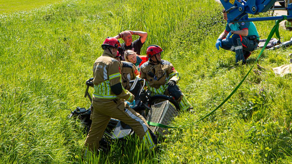 Volgens getuigen moest de duo-fiets plotseling uitwijken voor een tegenligger, waardoor het voertuig van de weg raakte en in de diepe sloot belandde. Een alerte agrariër die in de buurt was, schoot direct te hulp. Met zijn tractor wist hij de fiets in de modder te stabiliseren in afwachting van de hulpdiensten.