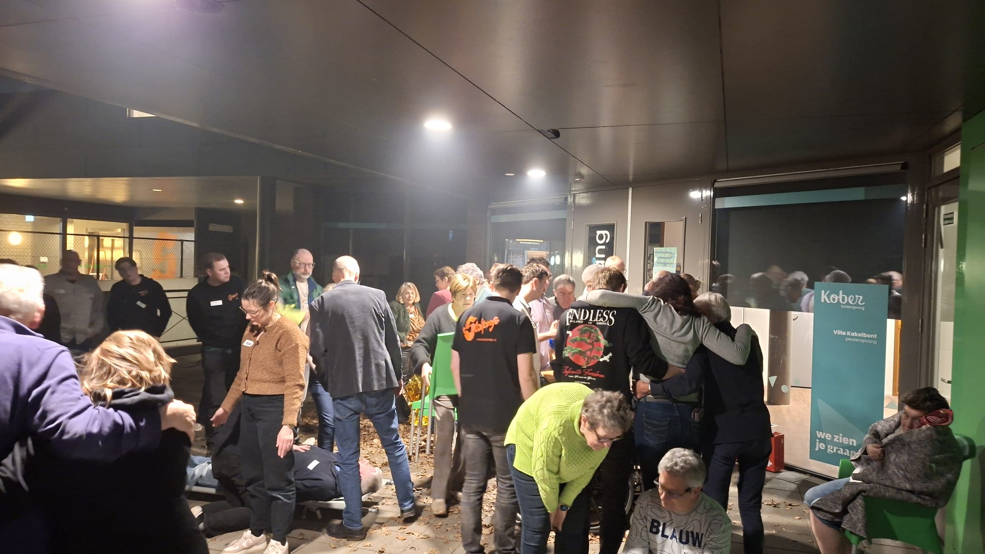 Het brandalarm gaat af. “Douw eens tegen die klink aan!”, klinkt het door de hal van ’t Stokperdje in Zundert terwijl deelnemers een verongelukte man op een brandcard naar buiten voeren. In een andere hoek van het gebouw klimt een man met behulp van een groep deelnemers verwond de trap af. Er zijn tien verschillende oefeningen te zien op deze EHBO-avond, want al lijken de scenario’s soms een beetje extreem, ze zouden zo in het echt voor kunnen komen. “Zo krijg je in de praktijk toch de ervaring om beter, adequaat en sneller te handelen en daarbij moet het ook een hele leuke en leerzame avond zijn”, vertelt voorzitter Alex Vriends.