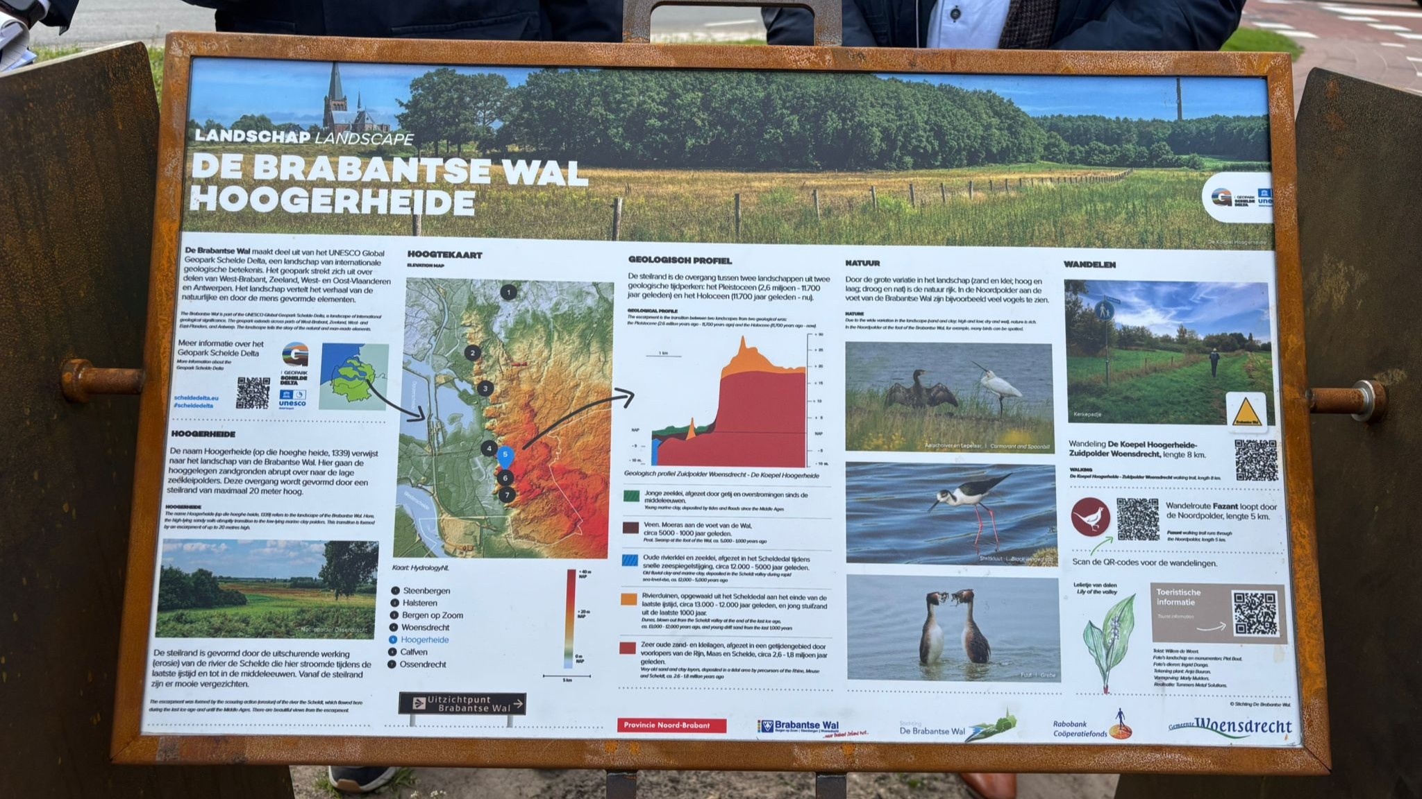 Wat de Brabantse Wal zo uniek maakt is de diverse natuur in het gebied. Van moerassen tot aan zandvlaktes, er is van alles te zien in de regio. “Op de borden kan je alle bijzondere natuur, vogels, planten en dieren zien. Elk bord bevat ook een doorsnede van het landschap zodat je de geologie kan zien. En aan de andere zijde van het bord kan je alle gemeentelijk Rijksmonumenten zien”, legt De Weert uit. Alle borden staan aan het begin van een wandelroute langs dit natuurgebied, die beginnen en eindigen bij een café.