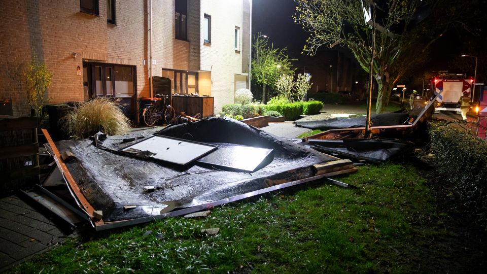 Door de harde wind is het dak van een rij huizen naar beneden gekomen. Dat gebeurde in de nacht van zondag op maandag aan de Kastanjeberg in Roosendaal. Ook kwamen zonnepanelen naar beneden. Een stuk is in een boom beland.