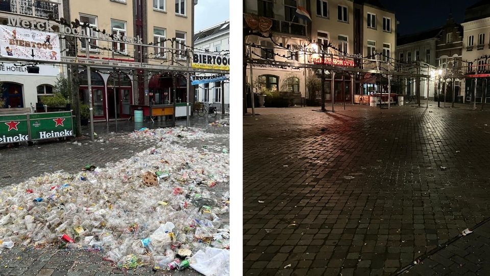 Het verschil in straatafval: rechts de Vastenavend 2026 op 't Beursplein. links hetzelfde horecaplein een jaar eerder. (Foto's: gemeente Bergen op Zoom)
