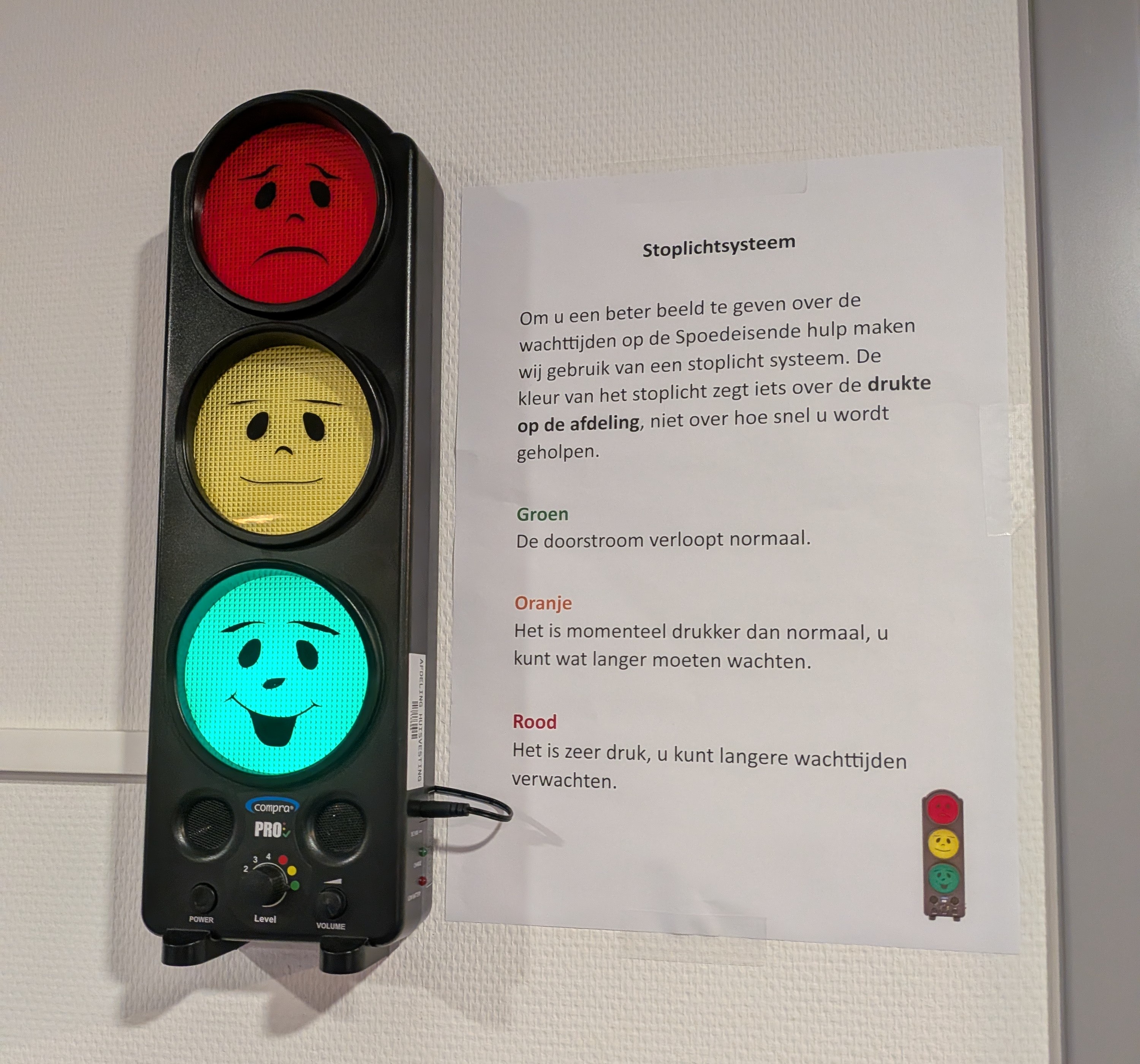 Mijn gids neemt de tijd voor me en vertelt hoe zij en haar collega’s proberen om de nodige onrust vooraf weg te nemen met veel en zo concreet mogelijk communiceren. “Als je uitlegt waarom dingen even duren, scheelt dat al enorm.” Een bloedonderzoek kost nu eenmaal minstens een uur, als het druk is soms meer. En bepaalde situaties gaan natuurlijk voor, niet alles vraagt om evenveel spoed. Daarom wordt er met kleurcodes gewerkt. En in de wachtruimte hangt sinds enige tijd een stoplicht, dat aangeeft hoe druk het is. Zo weten mensen een beetje waar ze aan toe zijn.