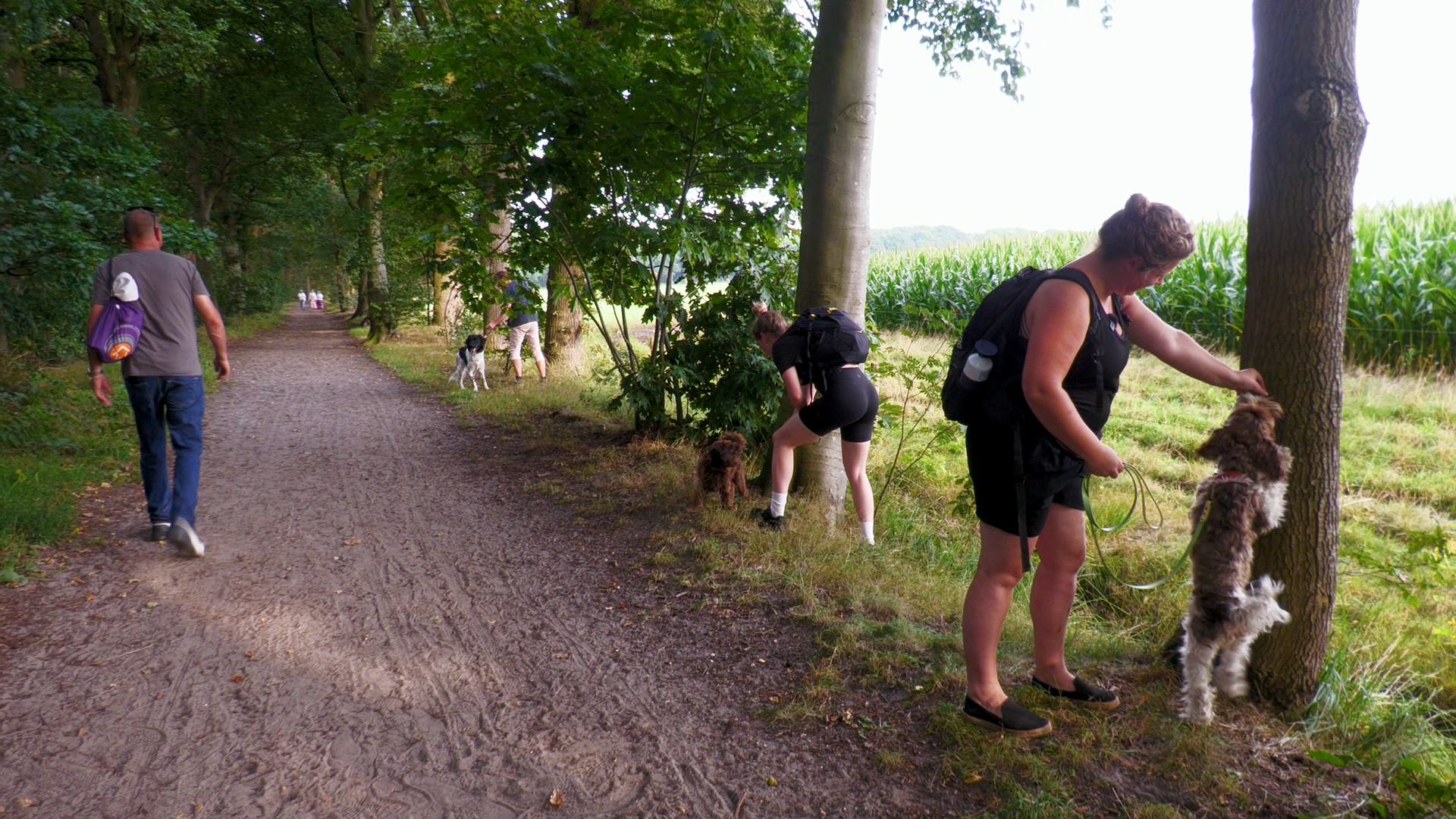 Na de introductie loopt de groep het bos in om met de rek- en strekoefeningen te beginnen. Baasjes nemen een brokje in de hand en houden hem vervolgens hoog tegen de boom aan. De honden moeten vervolgens tegen de boom aan staan om het lichaam goed op te rekken.