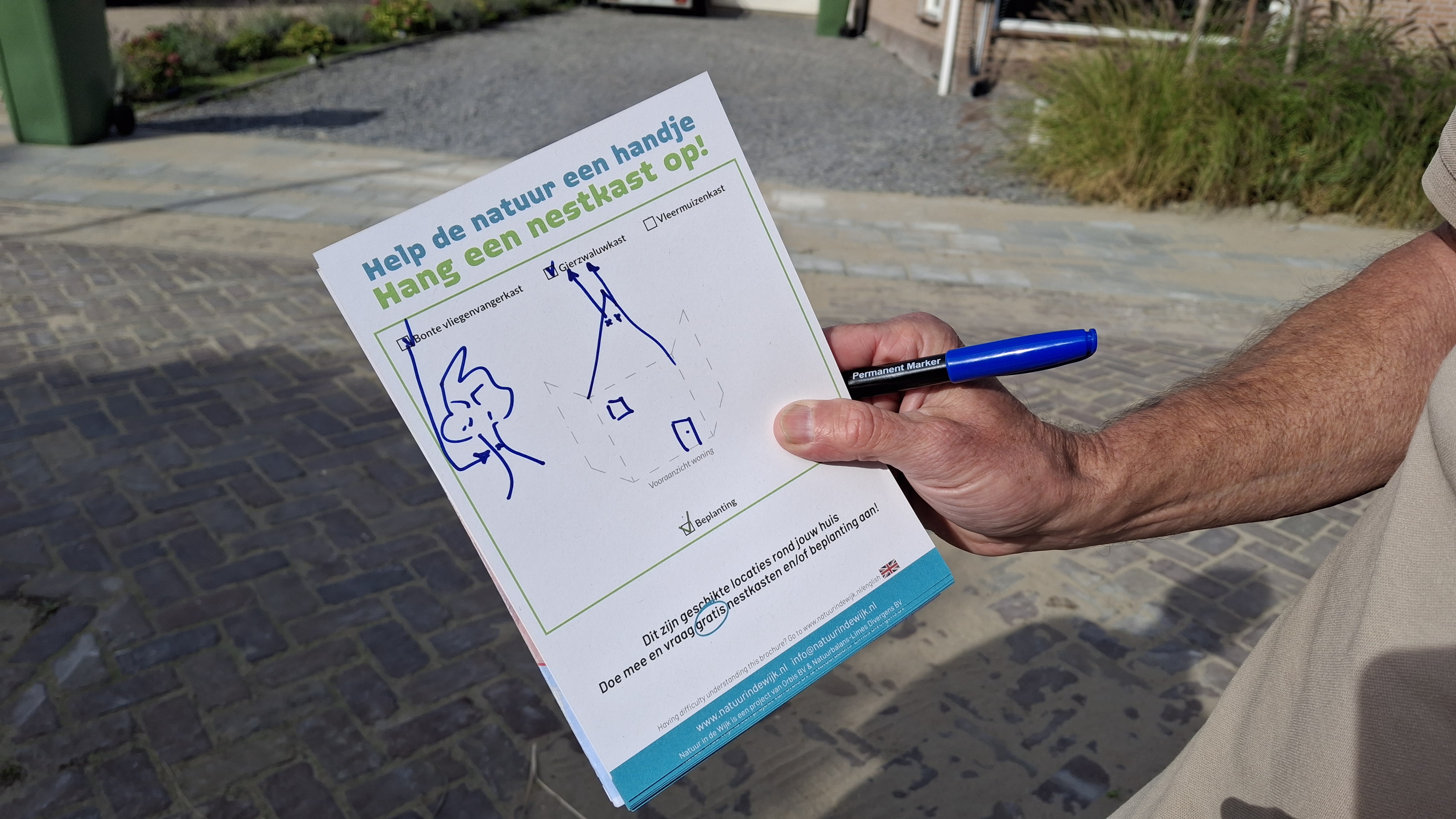 Tijdens hun wandelingen door de Klundertse straten letten Van den Berg en Van Hout op verschillende dingen. Bijvoorbeeld waar de zon opkomt en ondergaat en of er hoge bomen in de buurt staan. Op een folder schetsen de twee de plekken waar een nestkastje zou kunnen hangen. “Als je een puntdak heb tekenen we dat en dan zetten we kruisje waar een gierzwaluw- of een vleermuiskast kan hangen.”