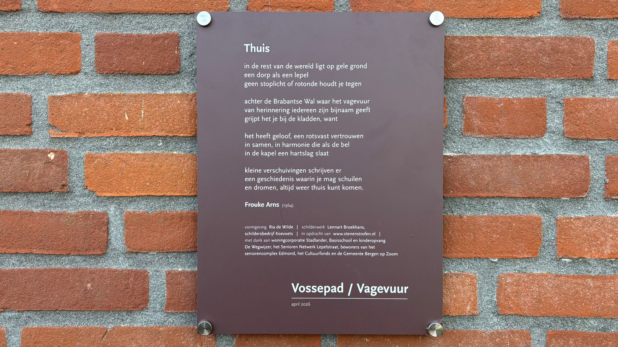 “In de rest van de wereld ligt op gele grond een dorp als een lepel. Geen stoplicht of rotonde houdt je tegen.” Zo begint het gedicht ‘Thuis’ in Lepelstraat, dat donderdag werd onthuld. Het maakt onderdeel uit van het initiatief om in elke wijk in de gemeente Bergen op Zoom een bijpassend gedicht te plaatsen. Dichter Frouke Arns wil in het gedicht de saamhorigheid van de inwoners belichten.