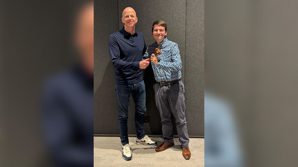 Alex Raggers (links) draagt het stokje over aan Martijn Verbeek (rechts). (Foto: VLP Roosendaal)
