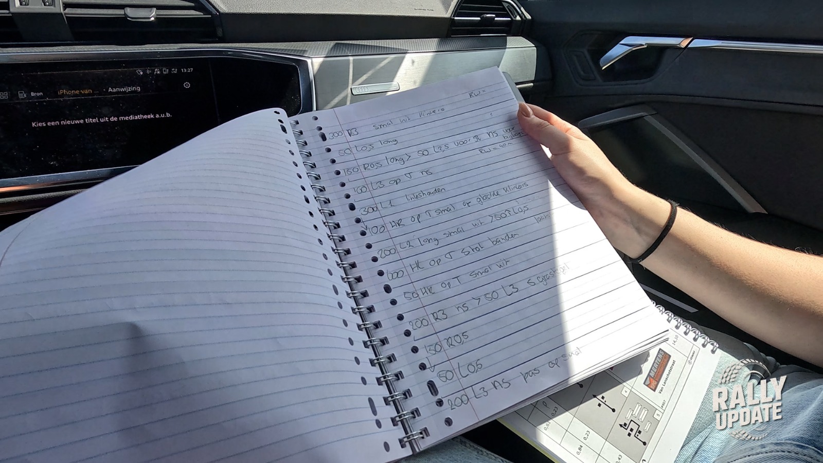 Het boekje van Eva is gestructureerd ingedeeld. “Links schrijf ik de afstanden”, legt ze uit. “Daar begin ik mijn zin dus ook mee.” Vervolgens volgt er een instructie en bijvoorbeeld in welke versnelling een bocht genomen moet worden.