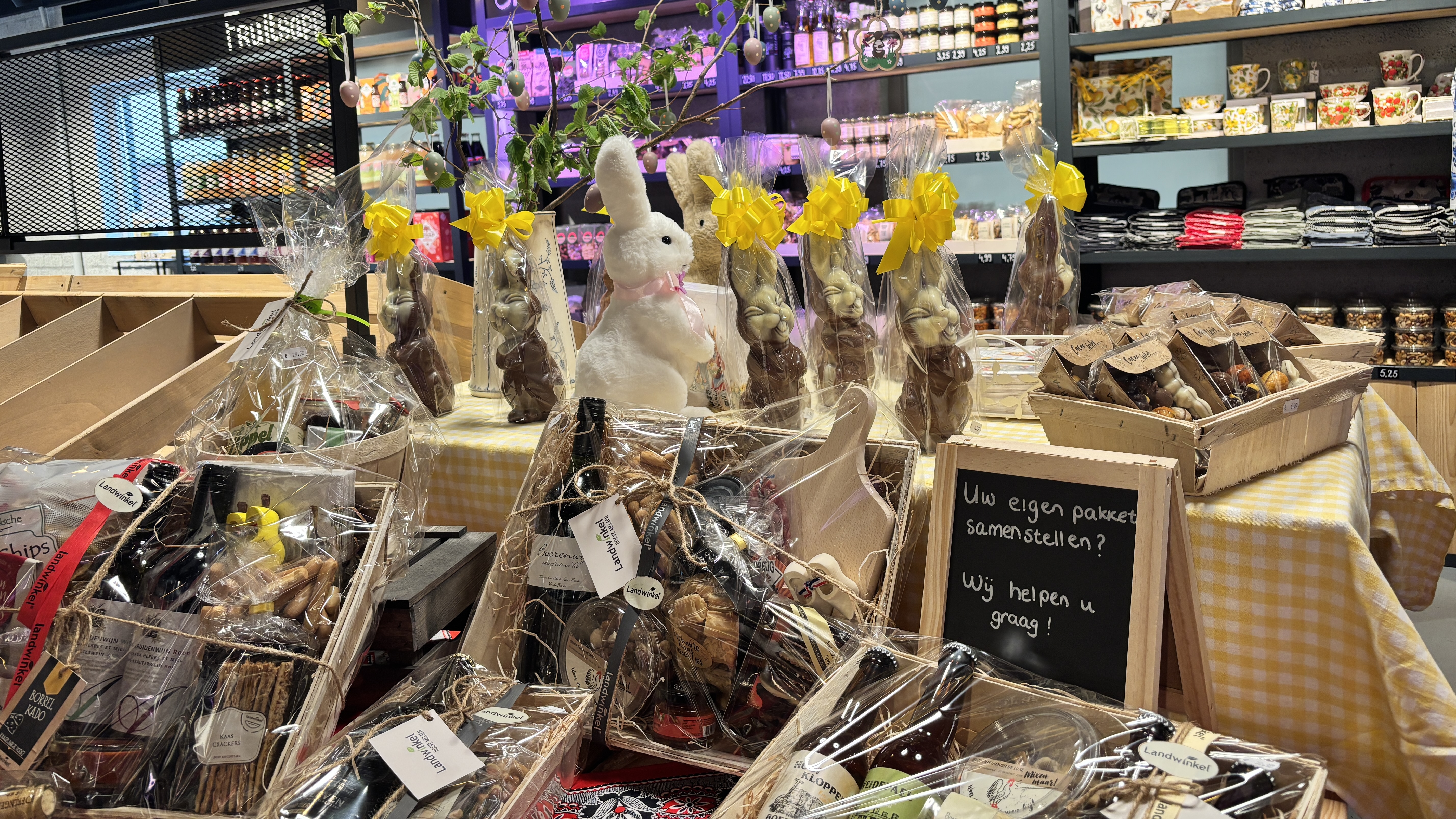 Voor verjaardagen kunnen klanten ook naar de landwinkel komen. Ze verkopen bijvoorbeeld zelf gemaakte cadeaupakketten. “Hier zitten lekkere snacks in met jam en een lokaal wijntje”, laat Jessy zien. Klanten mogen ook zelf een pakket samenstellen. Naast de pakketen zijn er ook andere cadeaus te koop. Er staan bijvoorbeeld ook mokken, bakjes, schaaltjes, en ovenwanten in de winkel.