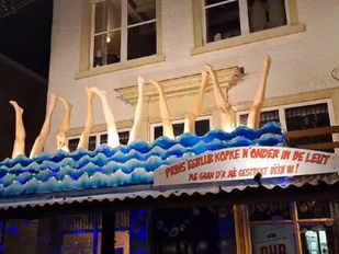 · Grote, blauwe golven met daarboven uitstekende en daadwerkelijk bewegende benen passen bij het Vastenavendmotto 'Kopke n'onder in de leut'.