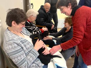 · Bewoners van Woonzorgcentrum Onze Stede kregen dinsdagmiddag kwispelend en blaffend bezoek van zeven labrador puppy's.