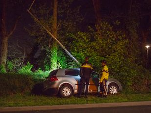 · De lichtmast brak volledig af door de impact en belandde in de sloot. Een aannemer moest de voeding komen redden.