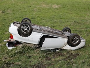 Auto vliegt uit bocht en belandt ondersteboven in weiland