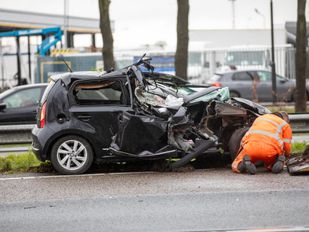 · De bestuurster van de auto botste in een file tegen een vrachtwagen aan. Ze kon nog net op tijd wegsturen, wat erger heeft kunnen voorkomen.