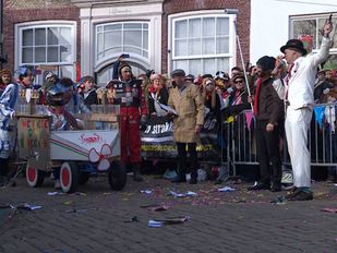 · Deelnemers stormden vanaf café de Kaai over de Dubbelstraat richting de zeepbak, om vervolgens met een afsprong de bel aan te tikken.