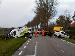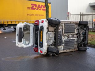 · Het busje kwam door de klap op zijn zijkant terecht. De auto belandde aan de andere kant met zijn neus in de sloot.