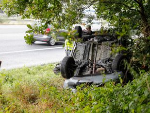 · Een auto is donderdagochtend op de snelweg A4 bij Bergen op Zoom van de weg geraakt en op zijn kop beland.