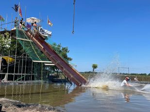 · Afgelopen zondagmiddag zijn tientallen deelnemers de uitdaging om van de schans te glijden, uit hun bootje te springen en de bel aan te raken, aangegaan.