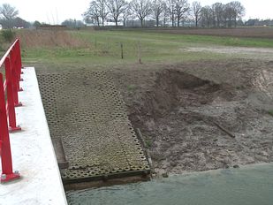 · Afgelopen maand stond er ineens een grote kraan bij de verzakte taluds. Delen zijn uitgegraven en er is nieuwe verharding geplaatst.