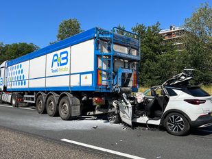 · Op de A17 bij Roosendaal, net voor knooppunt De Stok, is donderdagochtend een auto op een vrachtwagen gebotst.