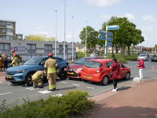 · Ambulancepersoneel heeft de inzittenden onderzocht maar er hoefde niemand naar het ziekenhuis. De kruising was tijdelijk afgesloten voor verkeer.