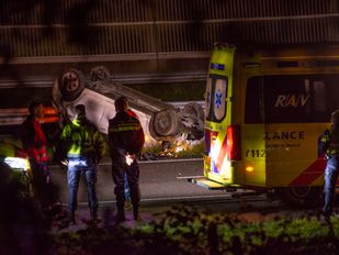 · Een auto kwam op z'n kop in de middenberm terecht. De bestuurder is met spoed naar het ziekenhuis gebracht.