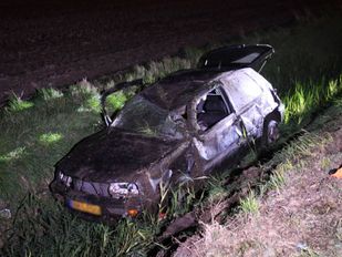 · Vlak na een bocht belandde de automobilist in de sloot. De man wist uit de auto te komen, en bij omwonenden alarm te slaan.
