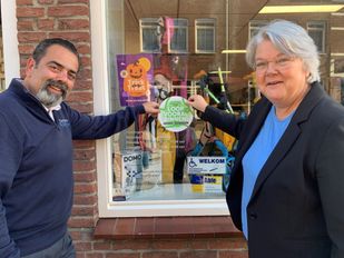 · 'Wij houden de kou buiten, maar loop vooral binnen', valt te lezen op de sticker in de etalage van de ondernemer uit Roosendaal.
