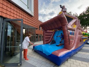 · De zomervakantie is weer voorbij. Samen met hun leerkracht roetsjten basisschoolkinderen van Het Palet in Bergen op Zoom naar hun nieuwe klas.