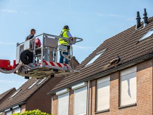 · Met behulp van een hoogwerker gingen een brandweerman en de man van de dierenambulance omhoog om de pauw te vangen.