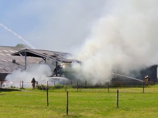 · Bij aankomst van de brandweer sloegen de vlammen al uit het dak. Korpsen uit de hele regio verlenen assistentie.