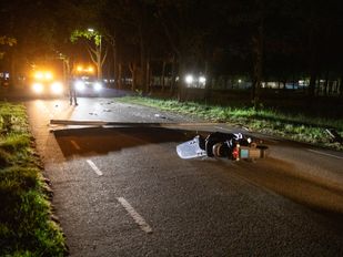· Een auto en een scooter hebben woensdag schade opgelopen bij een botsing met een lantaarnpaal die op de weg lag. De scooterrijder is ook lichtgewond geraakt.