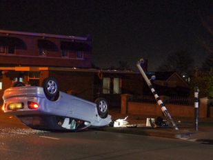 · Net als de auto, raakte ook een verkeerslicht beschadigd.