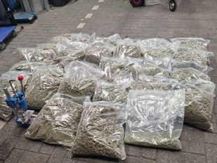 · Bij het doorzoeken van het huis vonden agenten plastic zakken vol met henneptoppen. Ook werd een pillenmachine gevonden.
