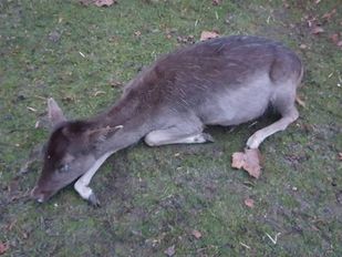 · Dinsdag zag iemand het hertje met een opgezwollen buik stil op de grond liggen. Het dier reageerde bijna nergens meer op.