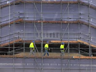· De toren van de Sint-Gertrudiskerk in Bergen op Zoom - beter bekend als de Peperbus- staat in de steigers voor groot onderhoud.